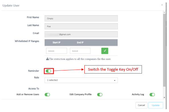 Step 5: Use the Toggle Key against the Reminder field to enable or disable sending reminders to User.