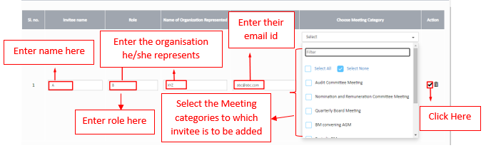 Note: Make sure the email ID entered here matches with the one in User Rights, in case the invitee is granted access to view the documents using BLISS Web Login for Invitees or our Board App, BLISSDOCS